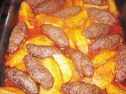 Bugün, güzel İzmirimize has bir köfte tarifi yazıyorum size. Sulu yemek kıvamındaki bu yemek için de okurlarımızdan Nur Oymakbaşı'nın önerisini paylaşmak istiyorum. Nur Hanım yaklaşık 2 senedir kızartmaları fırında yaptığını yazmış. Fırında kızartmanın usulü ise şöyle: Borcam tepsiyi yağlanır, buzdolabında beklettikten sonra kızartılacak ne varsa- kıtır ekmek, parmak patates, patlıcan, biber, kabak, köfte- tepsiye yerleştirilerek fırına verilir. Nur Hanım bu stildeki kızartmayı, sağlıklı, lezzetli ve pratik olmasının yanı sıra kokusuz ve daha temiz olması nedeniyle tercih ettiğini eklemiş. Doğrusu ben hiç denemedim ama gerçekten de kulağa hoş geliyor. Yazacağım tarifi yapmak isterseniz siz de fırında kızartmayı deneyebilirsiniz. Sevgili Nur Oymakbaşı'ya teşekkür ettikten sonra yemeğimizin tarifini yazalım. Bir kaba kıymayı, ıslatılmış ve suyu sıkılmış ekmek dilimlerini, yumurtayı, rendelenmiş soğanı, ince kıyılmış maydanozu, tuz, karabiber, kimyon, köfte baharı ve suyu ekleyip özleşene dek yoğuralım. Hazırlanan kıymadan ceviz büyüklüğünde parçalar koparıp, elle uzun şeritler vererek bir kenarda bekletelim. Patateslerin kabuklarını soyalım. Yıkayıp 2'ye ve er parçayı da 3'e bölelim. Tavaya yağı alalım. Önce patatesleri iki dakika kızartalım. Fırın tepsisine dizelim. Ardından köfteleri yağda 1 dakika kızartıp patateslerin üzerine dizelim. Domatesleri yarım ay şeklinde kesip aralarına yerleştirelim. Biberleri 2'ye bölüp tepsiye dizelim. Üzerine su veya arzuya göre salçalı su gezdirelim. Önceden ısıtılmış 200 dereceli fırında 20-25 dakika pişirelim. Suyu ile birlikte sıcak olarak servis yapalım. Afiyet olsun.