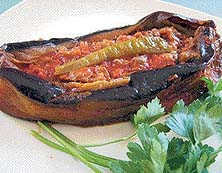 Yaz mevsimi sağlıklı beslenmek için yılın en ideal dönemi. Bu dönemde vücudumuz kendiliğinden ağır yemekleri istemezken zeytinyağlı sebze yemekleri, salatalar, meyveler ve özellikle de karpuz sofralarımızın vazgeçilmezleri oluyor. O yüzden havaların ısınmasını fırsat bilerek sağlıklı beslenmeye daha da özen göstermek, mümkünse bu beslenme biçimini bütün bir seneye yaymak en doğrusu. Bugün yazacağım kayık patlıcan tarifi de oldukça hafif bir yemek. "Patlıcan arası patlıcan" da diyebileceğimiz bu yemek için önce 3 adet patlıcanı birkaç yerinden delerek közleyelim. Kabuklarını soyup yıkayalım ve ince ince kıyalım. Ayrı bir yerde yoğurdu çırpalım. Zeytinyağını, limon suyunu, sirkeyi, sarımsağı, ince kıyılmış dereotunu, tuzunu ve karabiberini koyarak bir sos hazırladıktan patlıcanlarla karıştıralım. Kalan patlıcanları da yıkayıp alacalı olarak soyalım. Tuzlayıp 10 dakika beklettikten sonra suyunu sıkalım. Kağıt havlu ile kurutup bol yağda kızartalım. Daha sonra kağıt havlu üzerine alalım. Sonra servis tabağına alalım. Karnıyarıkta olduğu gibi patlıcanların karnını açarak hazırladığımız sosu patlıcanlara dolduralım. Domates ve biberle süsledikten sonra servis yapalım. Afiyet olsun.