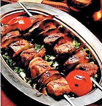 Bonfile kebabı için bonfileleri tokmakla döverek parçalamadan inceltelim. Çarliston biberlerin çekirdek yataklarını çıkarıp ince ve uzun olarak doğrayalım. Soğanlarımızı yemeklik; domatesleri fındık büyüklüğünde doğrayalım. Bir tavaya tereyağını alıp soğanları pembeleştirelim. Ardından biberleri tavaya aktarıp 3 dakika sote edelim. Buna domatesleri ekleyelim. 3 dakika daha kavurup tuz ve karabiberi de ekleyerek ateşten alalım. Bonfile parçalarının ortalarına bu harçtan yeterince koyalım. Bonfilelerin yan kenarlarını hafifçe içe döndürelim ve sararak kürdanla iki ucunu tutturalım. Mantarların sap kısımlarını çıkartalım ve nemli bir bezle temizleyelim. Sosislere çatalla birkaç delik açalım. Kiraz domatesleri de yıkayıp kurulayalım. Bonfilelerle birlikte sıra, sıra mantar, sosis ve domatesleri de dizelim. Şişleri tepsiye yerleştirelim. Yarım limon suyuna zeytinyağını ekleyerek karıştıralım. Bu sosa tuz, karabiber ekleyelim. Sosu fırça yardımıyla veya elimizle şişlere sürelim. Taze biberiye dallarını tepsiye yerleştirerek süsleyelim. Etler kızarana dek pişirdikten sonra firından alalım. Sıcak olarak servis yapalım. Afiyet olsun.