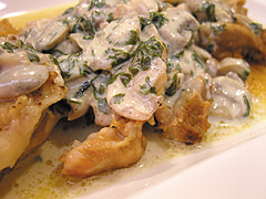 Peynir soslu kremalı tavuk için tavuk bagetleri keskin bir bıçakla 5- 6 yerinden çizelim. Üzerine tuz ve karabiber serpiştirelim. Bir tavada sıvı yağı kızdıralım ve tavukları sık sık çevirerek, tavanın ağzı kapalı olarak yaklaşık 10 dakika süreyle kızartalım. Diğer yandan sosumuzu hazırlamak için tereyağı ile hazır süt kremasını bir tencereye aktarıp kısık ateşte ısıtalım. Rendelenmiş gravyer peynirini de ekleyip tahta bir kaşıkla sürekli karıştırarak eritelim. Peynir iyice eriyip, sos koyu bir kıvama gelince ılık tavuk suyunu tencereye koyalım. Ardından sosu ocaktan hemen indirip üzerine karabiber ekleyelim ve tahta kaşıkla karıştıralım. Tavuk bagetlerini, bir fırın kabına dizelim üzerine peynir sosu gezdirelim. Mısır gevreklerini ufalayarak sosun üzerine serpiştirelim. Servise sunmadan önce fırında 15 dakika hafif ısıtalım ve sıcak olarak servis yapalım. Afiyet olsun.