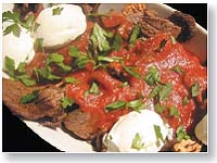 Bursa'nın en meşhur yemeklerinden biridir İskender kebabı. 1860'lı yıllarda keşfedilen bu yemeğin farkı, etin yatay değil de dikey olarak pişirilmesi. Ateş karşısında döne döne pişen et, sos, yoğurt ve pide ile zenginleşerek muhteşem bir yemeği vücuda getiriyor. Mutfağımızın en özel lezzetlerinden biri olan İskender kebabının uluslararası televizyon kanallarında bile tanıtılması bu yemeğin ne denli önemli bir tat olduğunu bize bir kez daha hatırlatıyor. Bugün, bu kebabı evinde yapmak isteyenler için ev yapımı İskender tarifi paylaşıyorum sizinle. Kebabın tarifi şöyle: Eti, döner eti inceliğinde doğrayalım. Tavaya sıvı yağı ve doğranmış olan etleri koyup kısık ateşte pişirelim. Diğer taraftan domatesleri, soğanları, iki diş sarımsağı küçük bir tencereye rendeleyelim ve bir tutam tuz ekleyerek kaynatalım. Suyu az gelirse az bir miktar su ilave edelim. Etler suyunu çekince biraz tuz ilave edelim ve kısık ateşte kızarmalarını sağlayalım. Pideleri fındık büyüklüğünde küp küp doğrayalım ve servis tabağına paylaştıralım. Kızarmış olan etleri servis tabağında pidelerin kenarına paylaştıralım. Hazırladığımız domates sosunu, sarımsaklı yoğurdu ve isteğe göre kızarttığınız tereyağını sırayla pidelerin üzerine yayın ve sıcak olarak servis yapın. Afiyet olsun.
