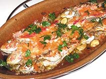 Fırında domatesli olarak pişirilen bu balık için önce fırını orta hararette ısıtalım. Ön hazırlık olarak soğanları piyazlık doğrayalım. Dolmalık biberin, sap ve çekirdekli kısmını çıkardıktan sonra, ince ince keselim. Domatesleri, kabuklarını soyup çekirdeklerini çıkarttıktan sonra, iri zar biçiminde doğrayalım. Barbunların pullarını kazıyıp karnını yaralım, temizleyelim ve bol suyla yıkayarak iyice temizlenmelerini sağlayalım. Diğer yandan limonu ince ince dilimleyelim. Küçük bir tencerede, tereyağı orta ateşte eritelim. Yağ erir erimez soğanı katıp 2 dakika sık sık karıştırarak sote edelim. Biberi ilave edip birkaç kere karıştırdıktan sonra domates, defne yaprağı, tuz ve karabiberi koyup 5 dakika pişirelim. Tencereyi ateşten alalım. Dereotunu ilave edip karıştıralım. Barbunları cam bir kaba yerleştirelim. Üzerlerine biberiyeyi serpelim. Domates sosunu da balıkların üstüne döküp, üzerine limon ve zeytinleri koyalım. Kabı, ısıtılmış fırına verip 20-25 dakika pişirelim. Yaklayık 45 dakika sonra kabı fırından alıp, balıkları sıcak olarak servis edelim. Afiyet olsun.