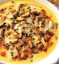 Fırında midye için ilk olarak soğanı doğrayalım ve sarımsağı ezelim. İkisini birlikte yağda pembeleştirelim. Dondurulmuş midyeleri çözülmeye başlamadan soğanlarla karıştıralım ve hepsini birlikte bir süre karıştıralım. Öte yandan yarım su bardağı su, un, yumurta, tuz ve karabiberi karıştıralım. Kaşar peynirini rendeleyelim ve üçte ikisini karışıma ekleyelim. hazırlamış olduğumuz bu sosu midyelerle de karıştıralım ve ısıya dayanıklı bir kaba boşaltalım. Kalan peyniri de üzerine koyup 250 derecede, ısıtılmış fırının orta sırasında yaklaşık olarak 15 dakika pişirelim. Piştikten sonra taze soğanın yeşil kısımlarını ince ince kıyalım ve midyelerin üzerine serpelim. Bu işlemden sonra midyeler servise hazır. Afiyet olsun.