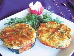 Peynirli patlıcan için patlıcanları alacalı soyalım ve uzunlamasına yaklaşık yarım santimetre kalınlığında ince ince dilimleyelim. Büyükçe bir tencereyi ocağa koyup, 3'te biri kadar su dolduralım. Üzerine koyduğumuz tel süzgece patlıcanları dizip tencerenin kapağını kapatalım. Yaklaşık 10 dakikada patlıcanları bu şekilde bekletelim. Buharda pişmiş patlıcanları bir kenarda bekletirken biberleri de közleyerek kabuklarını soyalım. Diğer yandan mısır ununu pulbiber ve tuz ile karıştıralım. Teflon bir tavayı 2 yemek kaşığı yağ ile yağladıktan sonra patlıcanların yarısını kurulayıp mısır unlu karışıma bulayarak boşluk kalmayacak şekilde tavaya dizelim. Patlıcanların üzerine dilimlediğimiz beyaz peyniri, onun üzerine de kırmızı biberleri dizdikten sonra patlıcanların diğer yarısını da mısır unlu karışıma bulayarak üzerini kapatıp avuç içi ile sıkıştıralım ve ocağa koyalım. Bir yüzü kızardıktan sonra tabağa alalım ve tavaya 2 kaşık yağı dökerek tekrar tavaya koyalım, diğer yüzünü de kızartalım. Her iki tarafı da kızardıktan sonra servis tabağına alıp maydanoz ile süsleyerek servis yapalım. Afiyet olsun.