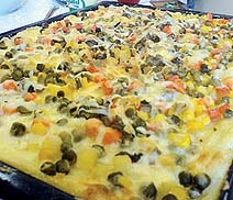 Bademli karışık sebze için 2 çorba kaşığı sıvı yağı bir tava koyup kızdıralım. Soğanı yemeklik doğradıktan sonra tavaya koyarak öldürelim. Bezelyeleri, tuzunu ve karabiberini ekleyip birkaç dakika karıştırarak pişirelim. Patatesleri yıkayıp soyduktan sonra ince ince dilimleyelim. Yağladığımız fırın tepsisinin dibine ilk patates katını dizelim. Üstüne, bezelyelerin yarısını, dilimlenmiş tulum peynirinin yarısını, küp şeklinde doğradığımız domates ve jambonun yarısını döşeyelim. Tuz ve karabiber ilave ettikten sonra ikinci patates katını dizdelim. Diğer malzemelerin kalanını da aynı sırayla koyup işlemi bitirelim. Tüm yüzeyini 2 çorba kaşığı kıyılmış maydanoz, ince dilimlenmiş badem ve 2 çorba kaşığı eski kaşar rendesiyle kaplayalım. Tüm malzemenin üstüne 4 kepçe et suyu döktükten sonra kabı, önceden ısıttığımız 180 derecelik fırına verelim. 45 dakika fırında pişirdikten sonra çıkarıp servis yapalım. Afiyet olsun.