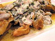 Peynir soslu kremalı tavuk için bagetleri keskin bir bıçakla 5-6 yerinden çizip üzerlerine tuz ve karabiber serpiştirelim. Bir tavada sıvı yağı kızdıralım ve tavukları sık sık çevirerek, tavanın ağzı kapalı olarak yaklaşık 10 dakika süreyle kızartalım. Diğer yandan sosu hazırlamak için tereyağı ile hazır süt kremasını bir tencereye aktarıp kısık ateşte ısıtalım. Rendelenmiş gravyer peynirini de ekleyip tahta bir kaşıkla sürekli karıştırarak eritelim. Peynir iyice eriyip, sos koyu bir kıvama gelince ılık tavuk suyunu tencereye koyalım. Ardından sosu ocaktan hemen indirip üzerine karabiber ekleyelim ve tahta kaşıkla karıştıralım. Tavuk bagetlerini, bir fırın kabına dizelim üzerine peynir sosu gezdirelim. Mısır gevreklerini ufalayarak sosun üzerine serpiştirelim. Servise sunmadan önce fırında 15 dakika hafif ısıtalım ve sıcak olarak servis yapalım. Afiyet olsun.