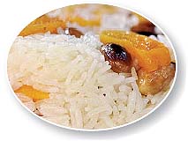Kayısılı pilav için ilk olarak ince ince doğradığımız kuru soğanı, sıvı yağda pambeleştirelim. Daha sonra sırasıyla; derisini ayıkladığımız ince doğranmış tavuk budu, kayısı, üzümler, baharatlar ve pirinç ilave edip birkaç dakika kavuralım. Üzerine sıcak tavuk suyunu ilave edip çok hafif ateşte suyunu çekene kadar pişirelim. Ardından üstüne bir peçete örtüp yaklaşık 15-20 dakika demlendirelim. Sonra bir kek kabına veya çukur bir kaseye boşaltıp hafif bastırarak şekil almasını sağlayalım. İçine pişirilmiş yufka serilen bir servis tabağına ters çevirelim. Üzerini dere otu ve domateslerle süsleyelim ve alta serdiğimiz yufkanın kenarlarını volanlı bir şekilde kumaş havası vererek kıvıralım. Buharlaştırılmış tavuk suyuyla hafif ıslattıktan sonra servis yapalım. Afiyet olsun.