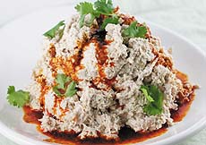 Çerkes tavuğu için öncelikle tavuğu 2 adet büyük soğanla birlikte pişirelim ve bir kenarda soğumaya bırakalım. Soğuduktan sonra tavukların derilerini ayıklayıp, kemiklerinden ayıralım ve küçük küçük tiftelim. Bir tavada mısır ununu tavuk suyuyla kavurarak pişirip hamur kıvamına getirelim. Cevizi robotta iyice çekelim. Sarımsak ve salçayı da ekleyip çekmeye devam edelim. Çerkes tavuğunun üzerini süslemek için çektiğimiz cevizlerin yüzeyine çıkan ceviz yağından yarım çorba kaşığı bir kabın içine ayıralım. Robottaki sarımsaklı cevizin içine, pişirmiş olduğumuz mısır ununu ilave edip iyice çekelim ve azar azar tavuk suyu ilave ederek boza kıvamında bir sos elde edene kadar çekmeye devam edelim, tuzla tatlandıralım. Robottaki sosu tiftilmiş tavukların üzerine dökelim, karıştırıp servis tabağına alalım. Üzerine, bir kenara ayırmış olduğumuz ceviz yağını gezdirip soğumaya bırakalım. Daha sonra da arzu ettiğimiz ısıda servis yapalım. Afiyet olsun.