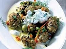 Yunan usulü köfte için; salatalık ile biberi temizleyip yıkayalım; ikiye bölüp küp küp keselim. Soğanı da soyup aynı şekilde doğrayalım. Dereotunu ayıklayıp yıkayalım ve garnitür için birkaç dalını ayırıp, kalan kısmını ince ince kıyalım. Çekirdeksiz yeşil zeytinleri yıkayıp ardından doğrayalım. Kıymayı, büyük bir kasede 250 gram süzme yoğurt, salatalığın yarısı, biber, zeytin, dereotu ve yumurta ile karıştıralım. Üzerine tuz ve bolca karabiber ekleyip iyice yoğuralım. Hazırladığımız karışımdan yaklaşık 15 tane köfte yuvarlayalım. Cacık için kalan süzme yoğurdu diğer yoğurt ile karıştıralım. Zeytinyağını ekleyip tuz ve karabiber ile tatlandıralım. Sarımsağı soyup rendeleyelim. Kalan salatalık küpleri ile birlikte yoğurda ilave edip iyice karıştıralım. İsteğe bağlı olarak nane ekleyelim. Sıvı yağı bir tavada kızdırıp köfteleri önlü arkalı pişecek şekilde yaklaşık 5 dakika kızartalım. Tabaklara paylaştırıp üzerlerine birer kaşık cacık dökelim. Köfteleri birer dal dereotu ile süsleyerek servis yapalım. Afiyet olsun.