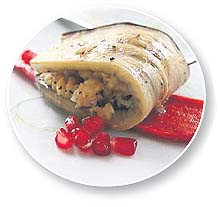 Nohutlu patlıcan sarma için 1 gece suda bekletilmiş nohutu süzelim. Soğuk su dolu bir tencereye alıp kaynatalım ve kaynayınca altını kısıp yumuşayana kadar pişirielim. Suyu tekrar süzüp nohutları irice dövelim. Öte yandan bir tavayı ısıtalım, zeytinyağı ve doğranmış soğanı ekleyelim. Soğan rengini kaybetmeden yumuşayana kadar kavuralım. Ardından sarımsağı ve kimyonu ekleyip 1 dakika daha kavuralım. Nohutları da ekleyip karıştıralım. Tahini, limon suyunu ve suyu ekleyelim. Tuz ve karabiberi de ektikten sonra soğuması için bir kaba alalım. Patlıcanları alacalı soyalım. Her birini boylamasına 6 parçaya kesip tuzlayalım ve acısının çıkması için suda 1 saat bekletelim. Daha sonra dilimleri yıkayıp kağıt havlu ile kurulayalım. Yağlı kağıt serili bir fırın tepsisine dizip üzerlerine fırçayla zeytinyağı sürelim. Biberleri dörde bölelim. Çekirdeklerini çıkarı p tepsiye dizelim, üzerlerine zeytinyağı sürüp patlıcanları ve biberleri 180 dereceli fırında yaklaşık yarım saat közleyelim. Ardından patlıcanları soğumaya bırakalım, biberleri ise bir kaba koyalım. Üzerine streçfilm geçirelim. Kap ılınınca biberlerin kabuklarını soyalım. Sos için tüm malzemeyi bir kasede karıştırıp tuz ve karabiber ekleyelim. Patlıcanların içine nohutlu içten yayıp saralım. Her birini biber dilimlerinin üzerine yerleştirelim. Üzerlerine nar ekşili sostan döküp servis yapalım. Afiyet olsun.