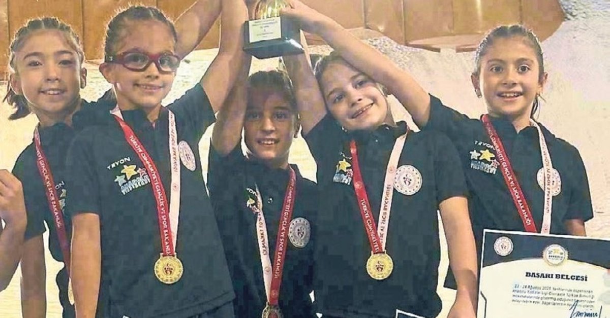 İzmir takımı olarak yarışan artistik cimnastik minikler takımı Beril Kara, Elis Kolukısa, Dila Dereboylu, Melek Alya Tezel ve Öznur Karasoy,