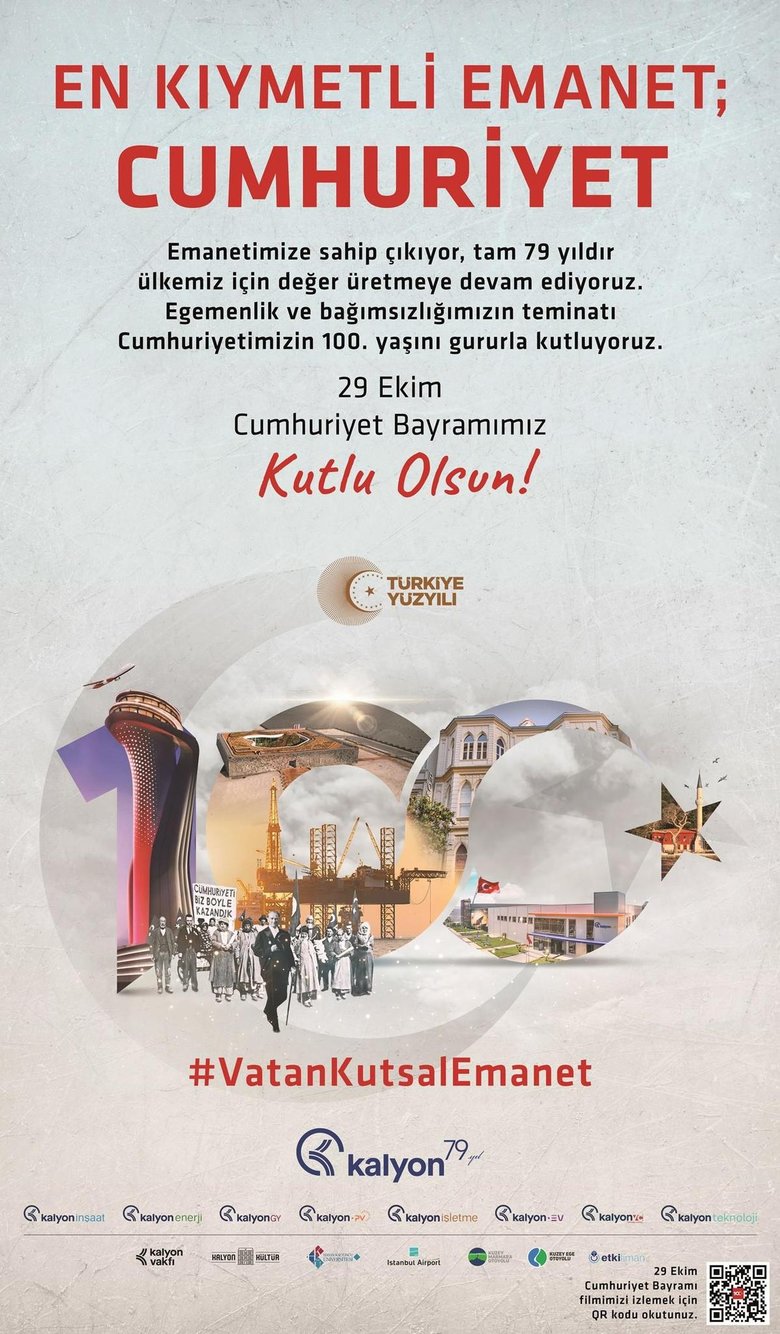 Yaklaşık 80 yıldır, Türkiye'nin ekonomik ve toplumsal kalkınmasına sürdürülebilir değer katma amacıyla pek çok farklı sektörde faaliyetlerini yürüten Kalyon Holding, Cumhuriyetimizin 100'üncü yılını "Vatan, Kutsal Emanet..." reklam filmi ile kutladı.