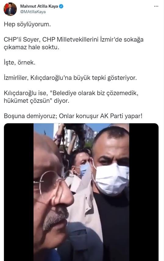 AK Parti İzmir Milletvekili Mahmut Atilla Kaya ise sosyal medya hesabından yaptığı paylaşımla Kılıçdaroğlu ve bölge halkından bir vatandaş arasında geçen diyaloğu paylaşarak, Kılıçdaroğlu ve İzmir Büyükşehir Belediyesi'ni eleştirdi.