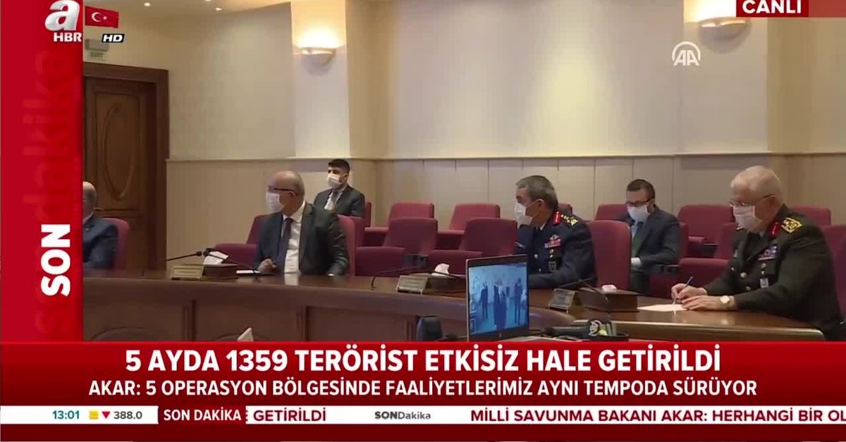 Bakan Akar, toplantıdaki değerlendirmesinde, bir yandan yeni tip korona virüs (Covid-19) salgını ile mücadele devam ederken diğer taraftan da Türk Silahlı Kuvvetlerinin terörle mücadele kapsamındaki harekatlarının sürdüğünü belirtti.