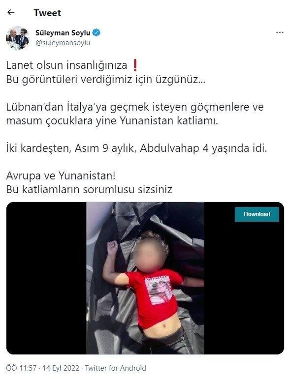 Soylu, sosyal medya hesabından yaptığı paylaşımda, "Lanet olsun insanlığınıza! Bu görüntüleri verdiğimiz için üzgünüz... Lübnan'dan İtalya'ya geçmek isteyen göçmenlere ve masum çocuklara yine Yunanistan katliamı. İki kardeşten, Asım 9 aylık, Abdulvahap 4 yaşında idi. Avrupa ve Yunanistan! Bu katliamların sorumlusu sizsiniz." ifadelerini kullandı.