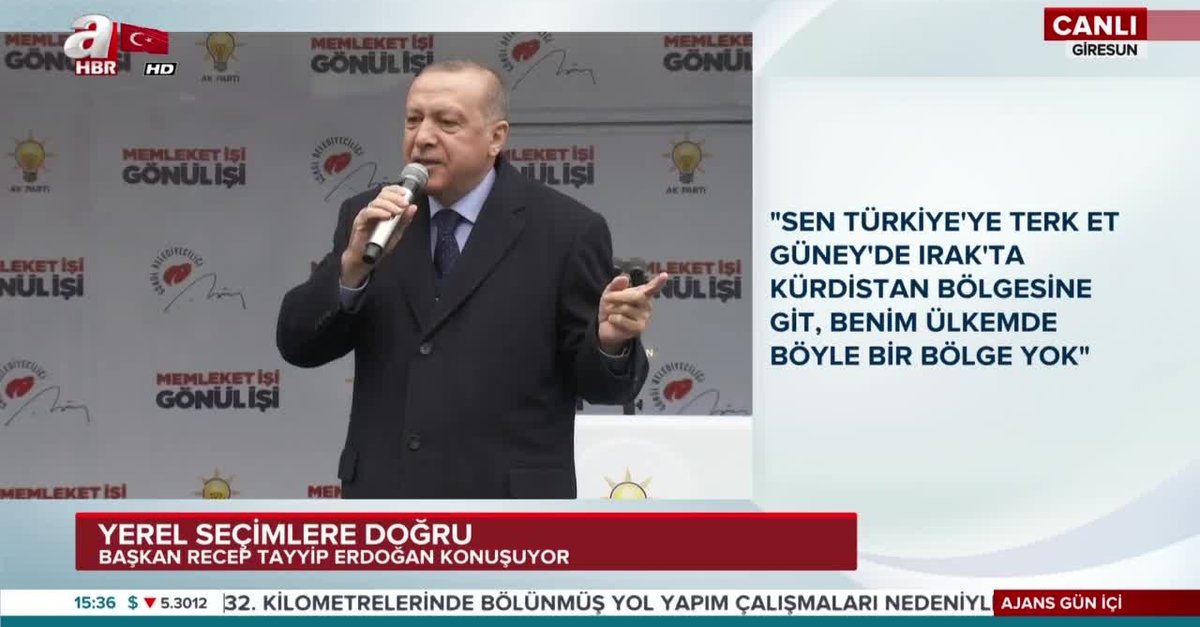 Giresun mitinginde halka hitap eden Başkan Erdoğan, HDP Eş Genel Başkanı Sezai Temelli'nin "Kürdistan'da kazanacağız" açıklamasını hatırlatarak, "Türkiye'de "Kürdistan diye bir bölge var mı?" Buyrun ne diyor Kürdistan'da biz kazanacağız. Sen Türkiye'yi terk et. Bizim Kürdistan diye bir bölgemiz yok. Güneyde Irak'ta Kürdistan bölgesine git.Benim ülkemde böyle bir bölge yok" dedi.