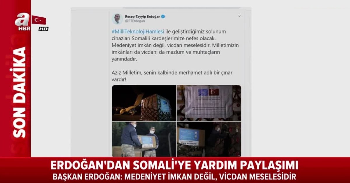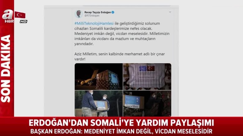 Başka Erdoğan paylaşımında "Milli Teknoloji Hamlesi ile geliştirdiğimiz solunum cihazları Somalili kardeşlerimize nefes olacak. Medeniyet imkân değil, vicdan meselesidir. Milletimizin imkânları da vicdanı da mazlum ve muhtaçların yanındadır. Aziz Milletim, senin kalbinde merhamet adlı bir çınar vardır!" ifadelerini kullandı.