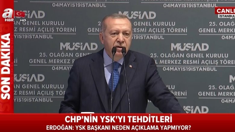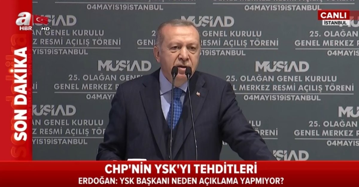 MÜSİAD 25. Olağan Genel Kurulu'nda konuşan Başkan Erdoğan, CHP vekillerinin İstanbul seçimleriyle ilgili YSK'yı tehdit eden açıklamalarına sert çıktı. Erdoğan, "Çabamız usulsüzlüklerle, yolsuzluklarla hukuksuzluklarla 31 Mart'ı kurban etmek istemiyoruz. İstanbul'da oyun var, yolsuzluklar var. CHP, YSK'yı uzun zamandır tehdit ediyor, YSK Başkanı çıkıp neden açıklama yapmıyor? 'Bizi nasıl tehdit edersiniz' demiyor? Ortada bir yolsuzluk var. Bu şaibenin bu yolsuzluğun ortadan kalkması gerekiyor." ifadelerini kullandı.
