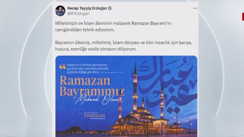 Son dakika haberi... Başkan Erdoğan sosyal medya hesabından Ramazan Bayramını kutlama mesajı yayınladı. Başkan Erdoğan mesajında "Milletimizin ve İslam âleminin mübarek Ramazan Bayramı’nı canıgönülden tebrik ediyorum. Bayramın ülkemiz, milletimiz, İslam dünyası ve tüm insanlık için barışa, huzura, esenliğe vesile olmasını diliyorum." ifadelerini kullandı.