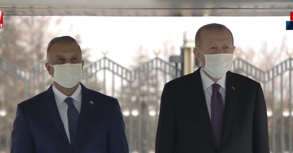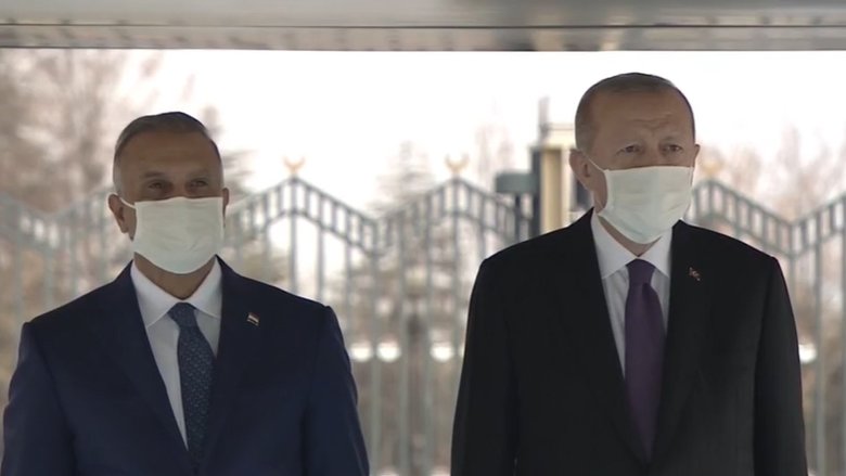 Erdoğan ve Kazımi'nin tören alanındaki yerlerini almalarının ardından, 21 pare top atışı eşliğinde iki ülkenin milli marşları çalındı.