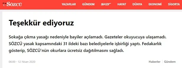 Türkiye koronavirüs salgını ile mücadele ederken, salgının yayılmasını önlemek için 31 ilimizde hafta sonunu kapsayacak şekilde 48 saatlik sokağa çıkma yasağı ilan edildi. Sokağa çıkma yasağının ilan edildiği şehirlerde vatandaş belediyelerden yardım talebinde bulunurken, CHP'li belediyeler ise vatandaşın talepleri yerine Sözcü Gazetesi'nin posta memurluğuna soyunarak kapı kapı gazete dağıttı.