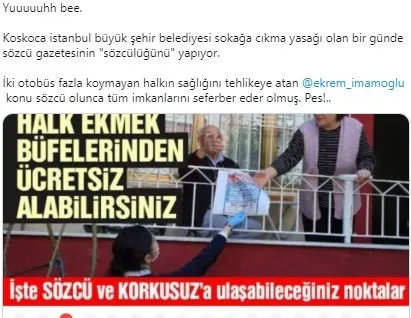 CHP'li belediyelerin "vatandaşa değil Sözcü'ye hizmet" anlayışına sosyal medyada tepki yağdı. Koronavirüs salgınına rağmen toplu taşıma araçlarını azaltarak halkın sağlığını tehlikeye atan ve vatandaşı isyan noktasına getiren CHP'li belediyelerin imkanlarını yandaşı bir medya kuruluşuna sonuna kadar sunması "rezillik" olarak yorumlandı.