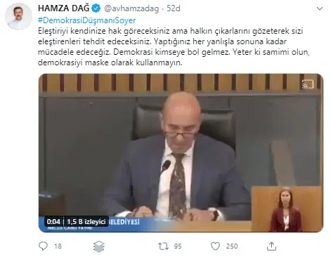 Hamza Dağ, Twitter'dan yaptığı paylaşımda, "Eleştiriyi kendinize hak göreceksiniz ama halkın çıkarlarını gözeterek sizi eleştirenleri tehdit edeceksiniz. Yaptığınız her yanlışla sonuna kadar mücadele edeceğiz. Demokrasi kimseye bol gelmez. Yeter ki samimi olun, demokrasiyi maske olarak kullanmayın." ifadelerini kullandı.