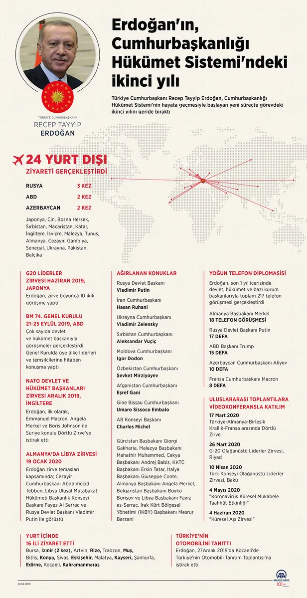 Başkan Recep Tayyip Erdoğan'ın 24 Haziran 2018'de seçilmesinin ardından 9 Temmuz'da yemin etmesiyle resmen hayata geçen Cumhurbaşkanlığı Hükümet Sistemi iki yılı geride bırakıyor. 2 yılın en yoğun gündem başlıkları ise Suriye, Libya ve koronavirüs süreci oldu.