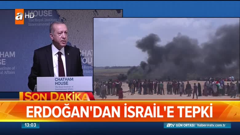 İşgalci İsrail'in katil askerlerinin, Kudüs'te açılacak Amerika'nın Büyükelçiliğini protesto eden Filistinlilere müdahalesi gerçek mermilerle oldu… Açılan ateş sonucu 2 Filistinli şehit oldu, çok sayıda da yaralı var... Yaşananlarla ilgili bir son dakika açıklaması İngiltere'de bulunan Cumhurbaşkanı Recep Tayyip Erdoğan'dan az önce geldi. Cumhurbaşkanı Erdoğan bu kararı talihsiz buluyor ve reddediyoruz dedi...