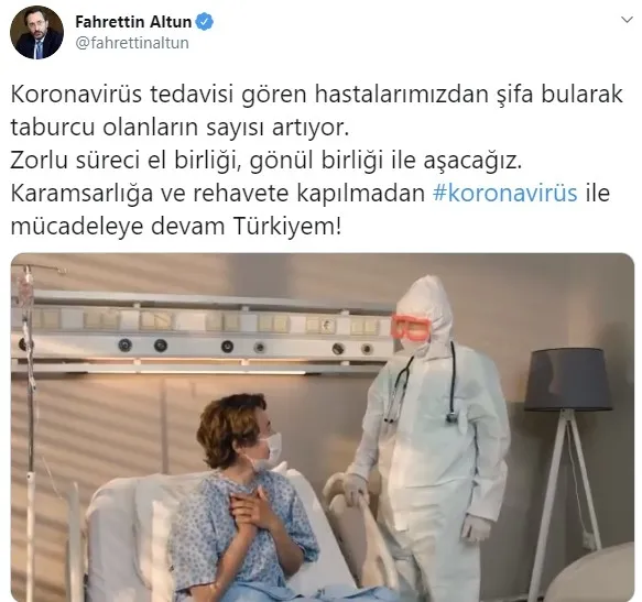 İletişim Başkanı Altun yaptığı açıklamada, "Koronavirüs tedavisi gören hastalarımızdan şifa bularak taburcu olanların sayısı artıyor. Zorlu süreci el birliği, gönül birliği ile aşacağız. Karamsarlığa ve rehavete kapılmadan #koronavirüs ile mücadeleye devam Türkiyem!" ifadelerine yer verdi.