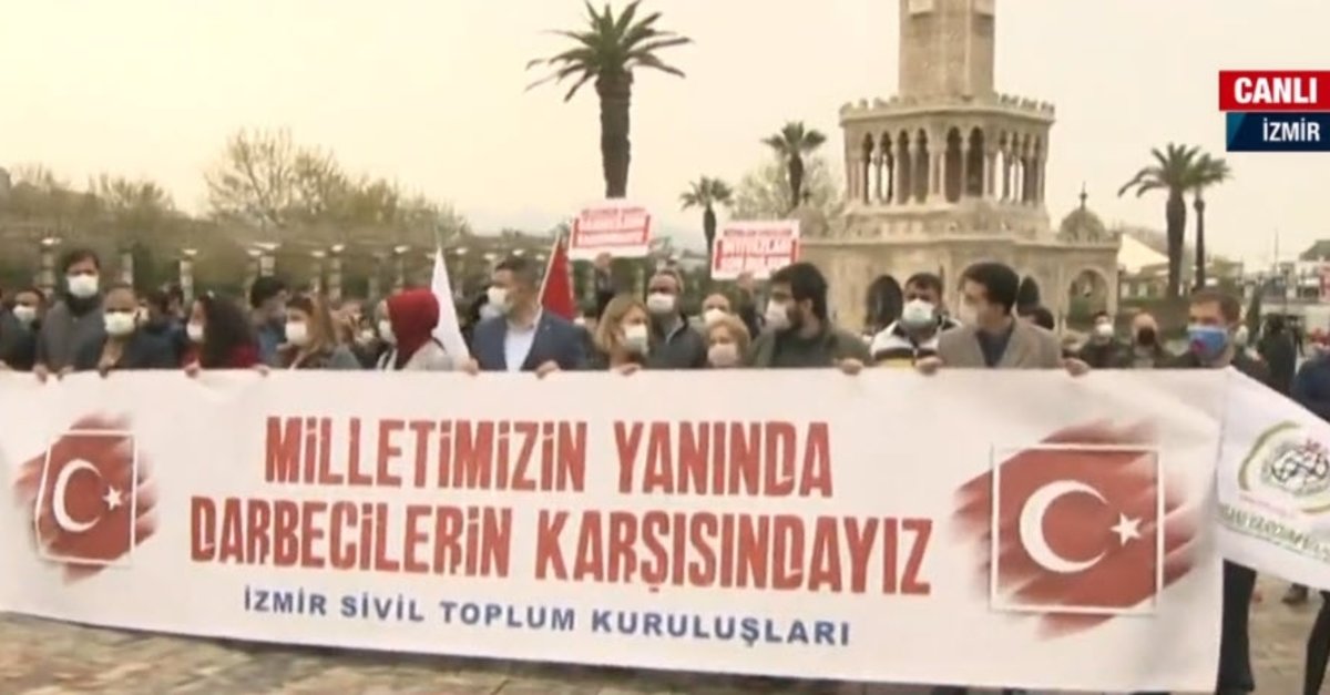 İzmir Sivil Toplum Kuruluşları Platformu üyesi dernek ve vakıflar, bazı emekli amirallerin açıklamasına tepki gösterdi. Platform adına Konak Meydanı'nda açıklama yapan Cüneyd Dayhan, 15 Temmuz'dan ders alamayan bazı emekli askerlerin milletin iradesine karşı bildiri yayınlama cüretine kalkıştığını söyledi.
