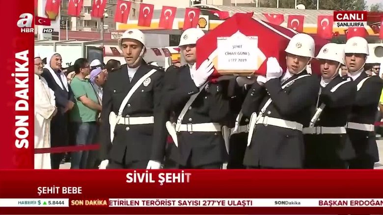 Dün terör örgütü PKK/YPG'nin düzenlediği havan saldırısında Akçakale'de şehit olan 9 aylık bebek Muhammed Omar, Vergi Dairesi Gelir Uzman Yardımcısı Cihan Güneş ve Ceylanpınar'da şehit olan 11 yaşındaki Elif Terim için tören düzenlendi.