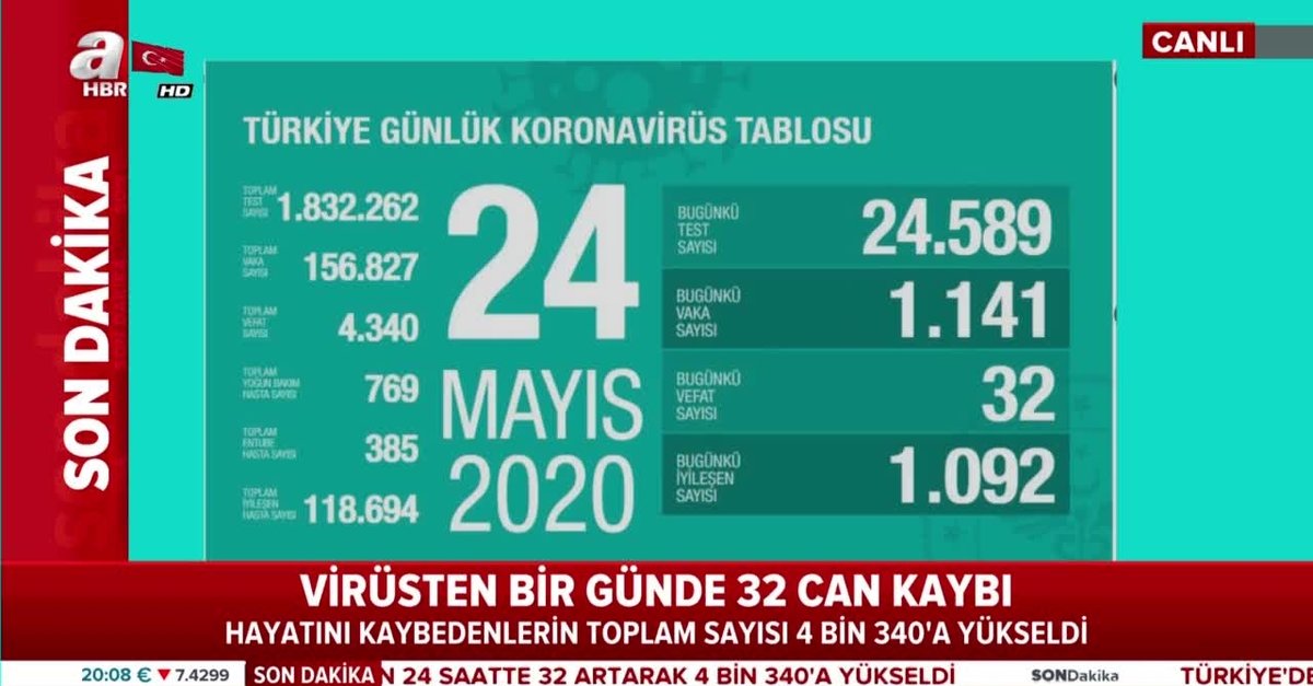 Son dakika haberi... Sağlık Bakanı Fahrettin Koca, Twitter'dan Türkiye'nin günlük koronavirüs tablosunu açıkladı. Türkiye'de son 24 saatte 1141 kişiye Kovid-19 tanısı konuldu, 32 kişi hayatını kaybetti, toplam vaka sayısı 156 bin 827, can kaybı 4 bin 340 oldu.