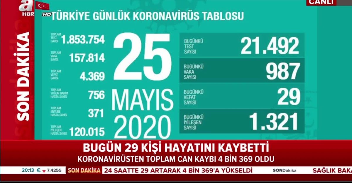 Son dakika haberi... Sağlık Bakanı Fahrettin Koca, Twitter'dan Türkiye'nin günlük koronavirüs vaka sayısını açıkladı. Türkiye'de son 24 saatte 987 kişiye Kovid-19 tanısı konuldu, 29 kişi hayatını kaybetti, toplam vaka sayısı 157 bin 814, can kaybı 4 bin 369 oldu. .