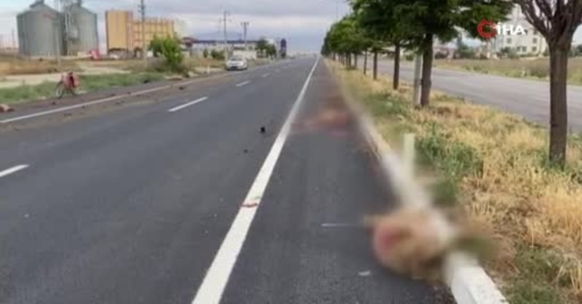 Afyonkarahisar'da meydana gelen kazanın görüntüleri dehşete düşürdü. Hafif ticari aracın küçükbaş hayvan sürüsüne çarpması sonucu 19 koyun öldü. Korkunç olayda hamile koyunun karnındaki kuzunun dışarı fırlaması ise görenleri kahretti.