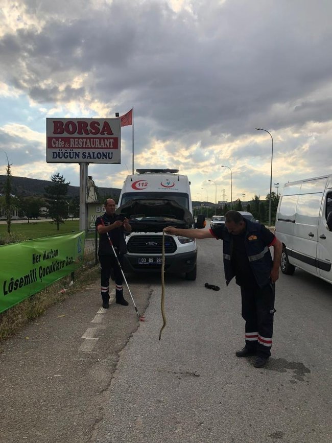 Hastanın sedye ile hastaneye konulmasının ardından ambulansın motor kısmından sesler geldiğini duyan ambulans şoförü Hasan Hüseyin Yılmaz aracın altına eğilip baktığında yılanı fark edince itfaiyeyi arayarak yardım istedi. İhbar üzerine hastaneye gelen ekipler motorun içine giren yılanı çıkardı. Ekipler ardından yılanı doğal ortamına bırakmak üzere koruma altına alarak bölgeden ayrıldı.