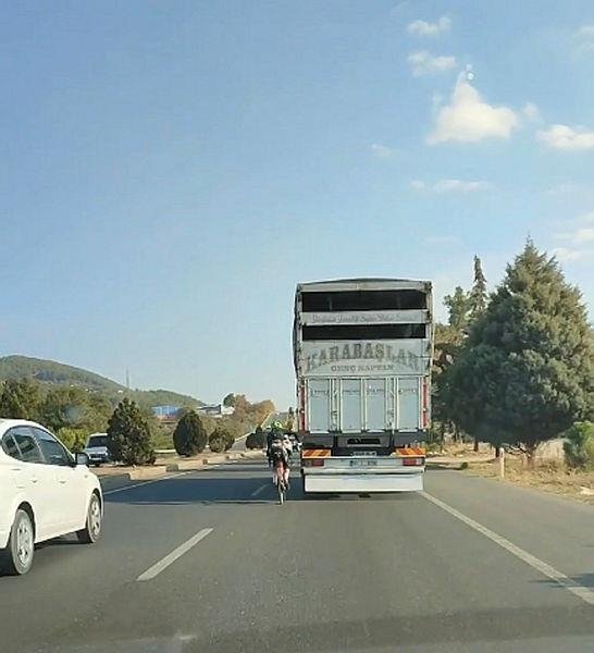 Aydın-Muğla D-550 Karayolu'nda bir kamyonun arkasına tutunarak giden bisikletli görenleri şaşkına çevirdi. Trafiğin yoğun olduğu saatlerde Aydın istikametinden Muğla istikametine seyir halinde olan kamyonun arkasında bisikletiyle ilerleyen sürücü, adeta canını hiçe sayarak kazaya davetiye çıkardı.