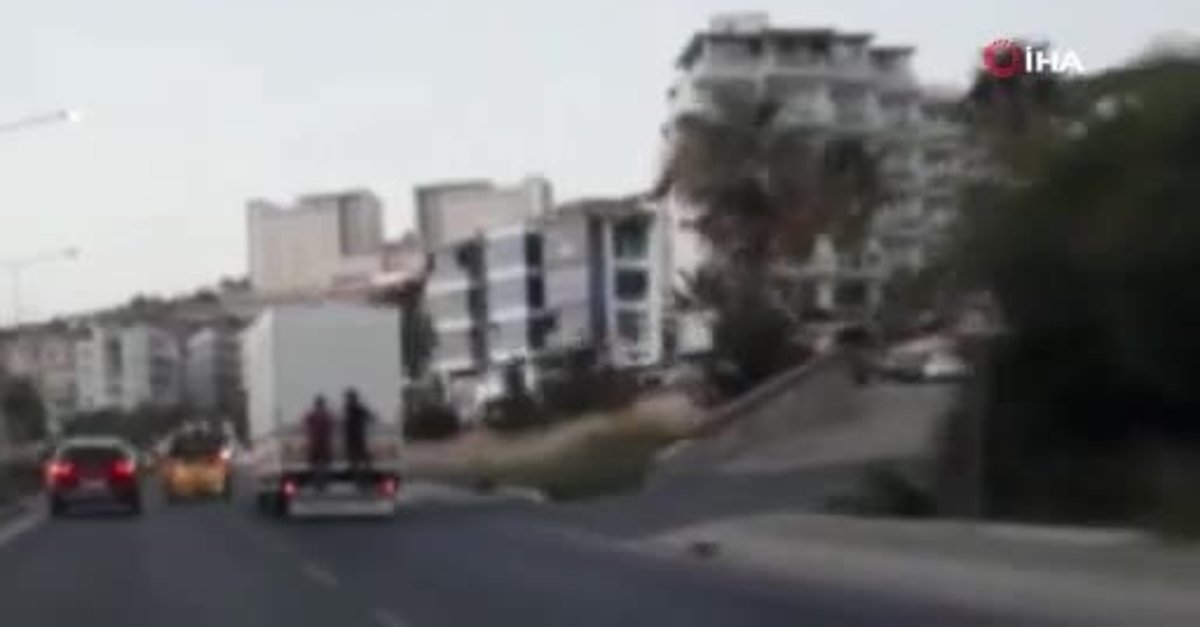 Aydın’ın Kuşadası ilçesinde kamyonet dorsesine tutunarak giden 2 genç yürekleri ağızlara getirdi. Vatandaşlar tarafından cep telefonuyla kaydedilen görüntüler pes dedirtti.