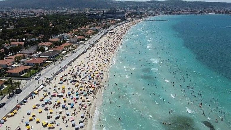 İzmir'in Çeşme ilçesi Kurban Bayramı'nın üçüncü gününde tatilcileri ağırlamayı devam ediyor. Nüfusu 1 milyona dayanan ilçenin en ünlü plajlarından olan Ilıca plajında yaşanan yoğunluk havadan dron ile görüntülendi.
