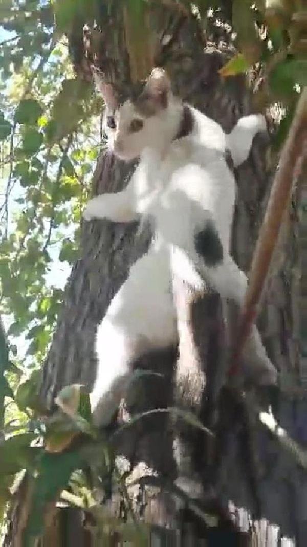 Karahayıt Mahallesi'nde pansiyon işleten Orhan Yıldız'a ait 3 aylık yavru kedi, bahçedeki dut ağacına çıktı. Dalların uçlarına doğru ilerleyen kedi, inemeyince sürekli miyavlamaya başladı. Sesi duyan Orhan Yıldız da kedisini ağaçta görünce kurtarmak için konuşmaya başladı. Bir yandan cep telefonuyla görüntü çeken Yıldız, diğer yandan kedisine talimatlar vererek kurtarmaya çalıştı.