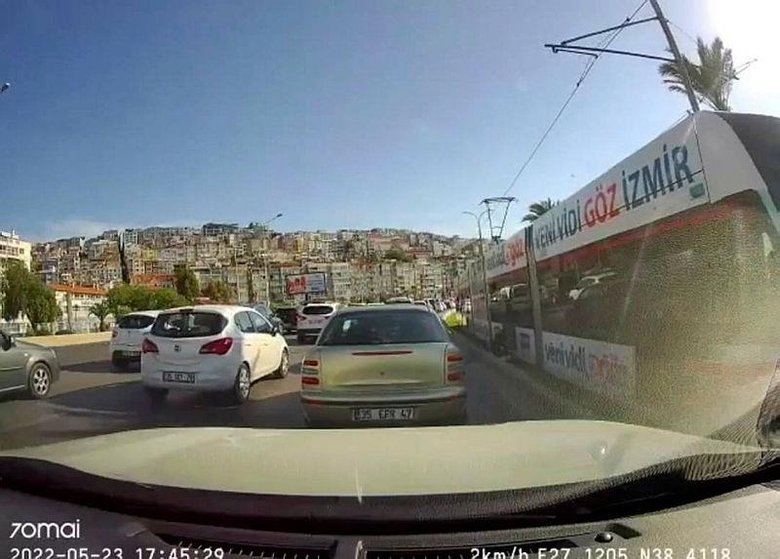 İzmir'in Konak ilçesinde, otomobillerin arasından koşarak yolun karşısına geçmeye çalışan 12 yaşındaki A.N.K., tramvayın çarpması sonucu ağır yaralandı. Kaza anı ise bir otomobilin kamerasına saniye saniye yansıdı.