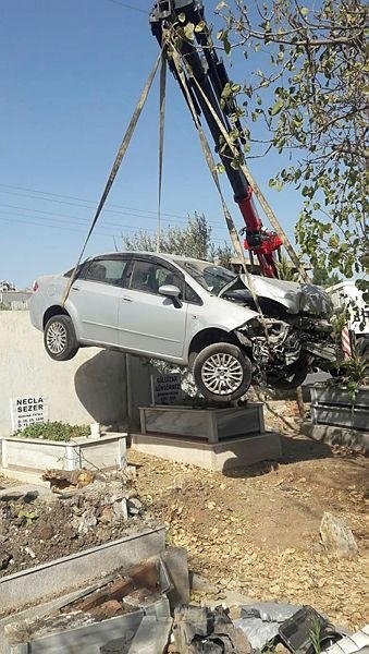 Mezarlık girişindeki birkaç mezarın üzerinden uçan otomobil, orta bölümde bulunan mezarların üzerine düştü. 6 mezarın zarar gördüğü kazada sürücü O.A., kazayı sıyrıklarla atlattı. Kazanın ardından olay yerine gelen polis ekipleri, O.A.'yı ifadesini almak üzere karakola götürürken, kazada zarar gören mezarlar için yakınlarına haber verildi.