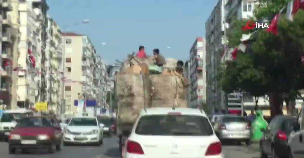 İnönü Caddesi'nde çekilen görüntüler bu kadar da olmaz dedirtti. İnönü Caddesi'nden Konak istikametinde seyreden bir kamyonette yolculuk yapan iki çocuk yürekleri ağza getirdi. Kasasında haddinden fazla yükseklikte karton yüklenen kamyonetin kasasındaki iki çocuğun tehlikeli yolculuğu diğer sürücülerin dikkatini çekti. 35 MA 2711 plakalı karton yüklü kamyonette kartonların üzerine oturan çocukların tehlikeli yolculukları kameralara an be an yansıdı. Çocukların hiçbir güvenlik önlemi almadan yaptığı yolculuk, kamyonetin gözden kaybolmasıyla devam etti.
