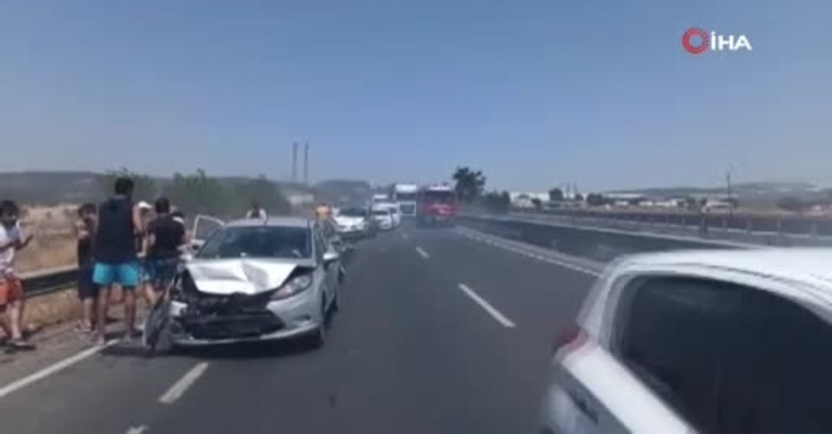 İzmir'in Aliağa ilçesinde orta refüjde bir anda çıkan yangın sürücülere zor anlar yaşattı. Rüzgarın etkisiyle büyüyen yangın sonucu dumanlar ortalığı kaplarken 4 araç birbirine girdi.