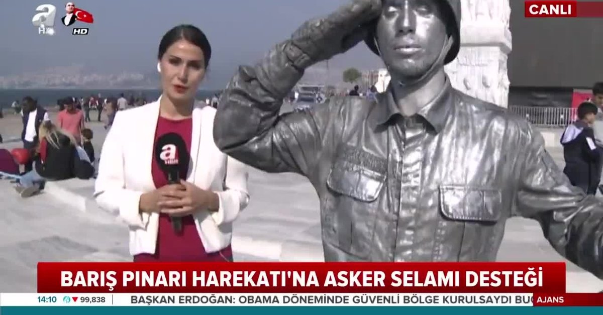 Asker kamuflajı ve Türk bayrağıyla İzmir Gündoğdu Meydanı'nda dün saat 19.00'dan bu yana adeta bir heykel gibi duran Mimus Performans Sanatları Atölyesi sanatçısı 26 yaşındaki İşçi'nin performansı, yaklaşık 18 saattir devam ediyor. İzmirli vatandaşların yoğun ilgi gösterdiği performansta genç yaşlı yüzlerce kişi Yunus İşçi'yle fotoğraf çektiriyor, öz çekim yapıyor. İşçi, performansını saat 19.00'da sonlandırmayı planlıyor.