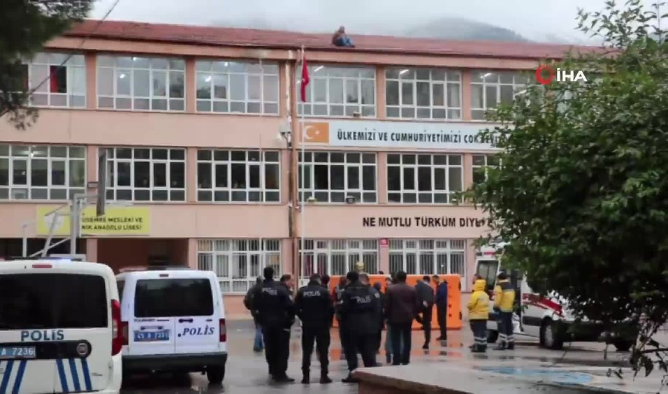 Manisa'nın Yunusemre ilçesinde Yunusemre Mesleki ve Teknik Anadolu Lisesinin çatısına çıkan okulun temizlik görevlisi intihar girişiminde bulunurken, o sırada okulda bulunan öğrenciler ise korku dolu anlar yaşadı.