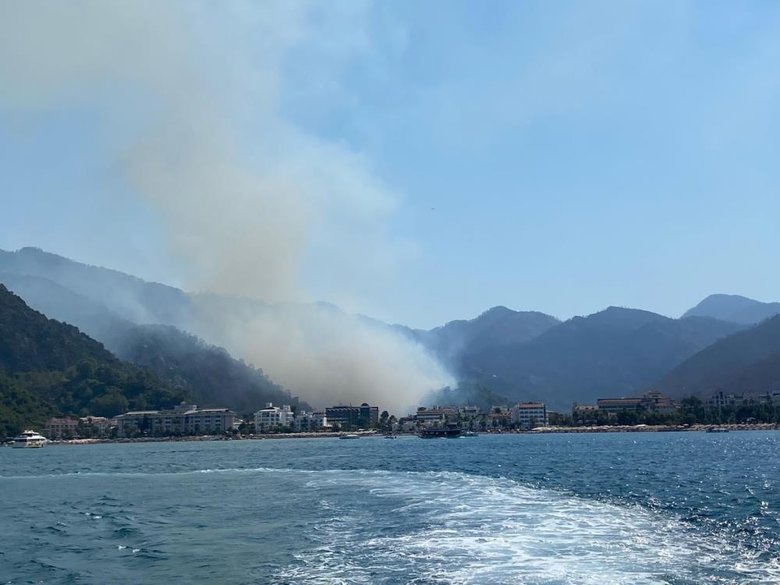 Muğla'nın Marmaris ilçesinde çıkan orman yangınına havadan ve karadan yoğun müdahale sürerken, Sahil Güvenlik unsurları tarafından uçak ve helikopterlerin su aldığı bölge deniz trafiğine kapatıldı.