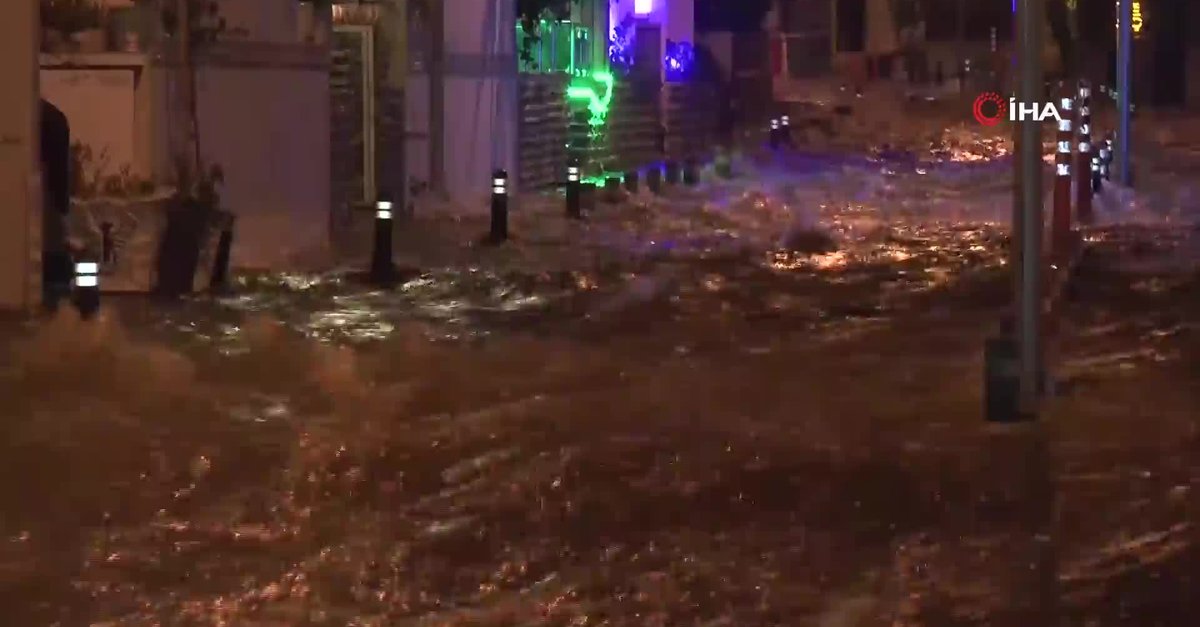 Muğla'nın Bodrum ilçesinde gece başlayan sağanak yağmur cadde ve sokaklar göle çevirdi. Bir anda bastıran sağanak yağmur nedeniyle su baskınları yaşandı, Bodrum-Turgutreis karayolu trafiğe kapatıldı. Ekipler yolları açmak için seferber oldu. İşte o anlar böyle kaydedildi...