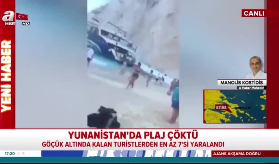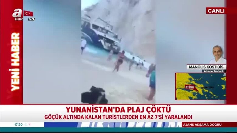 Yunanistan'ın dünyaca ünlü plajında çökme meydana geldi. İlk belirlemelere göre 1'i ağır 7 turist yaralandı. Yaşanan çökme anı ve turistlerin o anki panik anları cep telefonu kamerasına yansıdı. Detayları Atina'da bulunan A Haber muhabiri Manolis Kostidis canlı yayında aktardı.