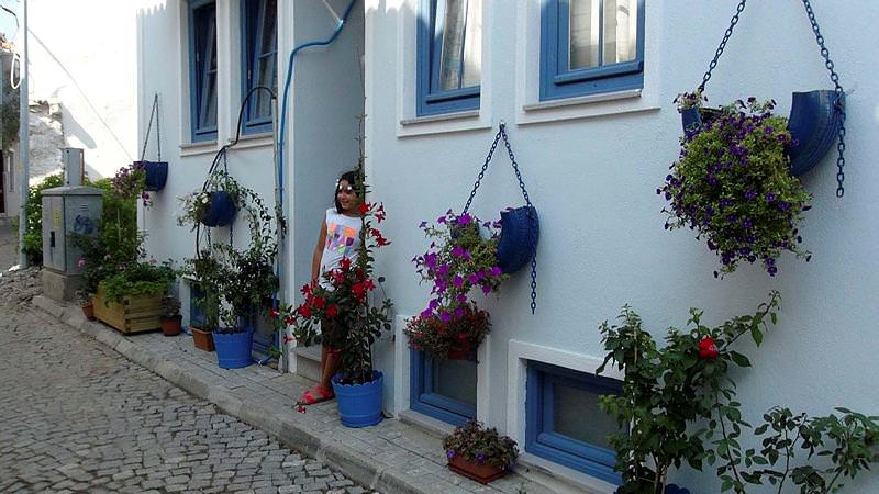 Birbirinden ilginç rengarenk kapılar ve pencerelerin çevreleri, yine rengarenk çiçekler dikkati çekiyor. Turistlerin en çok ilgisini üzerinde toplayan, adanın sıra dışı saksıları ve bu saksılardaki çiçekler oluyor. Rum Mahallesi'ndeki ev, pansiyon ve otellerin önlerinde ve duvarlarında bulunan saksılar arasında en ilginç olanı; içine toprak doldurulan ve ayağına ayakkabı giydirilen pantolon saksı. Bir otele ait kahvaltı bahçesinin giriş kapısı önündeki bu pantolon saksı, üzerinde açan sardunya çiçeğiyle herkesin dikkatini çekiyor.